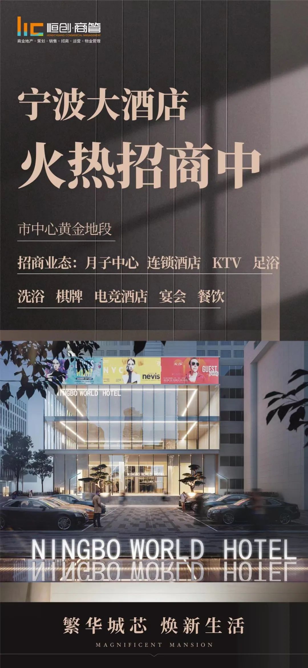 新項目招商業态:月子(zǐ)中心、連鎖酒店、KTV、足浴、洗浴、棋牌、電競酒店、宴會、餐飲。